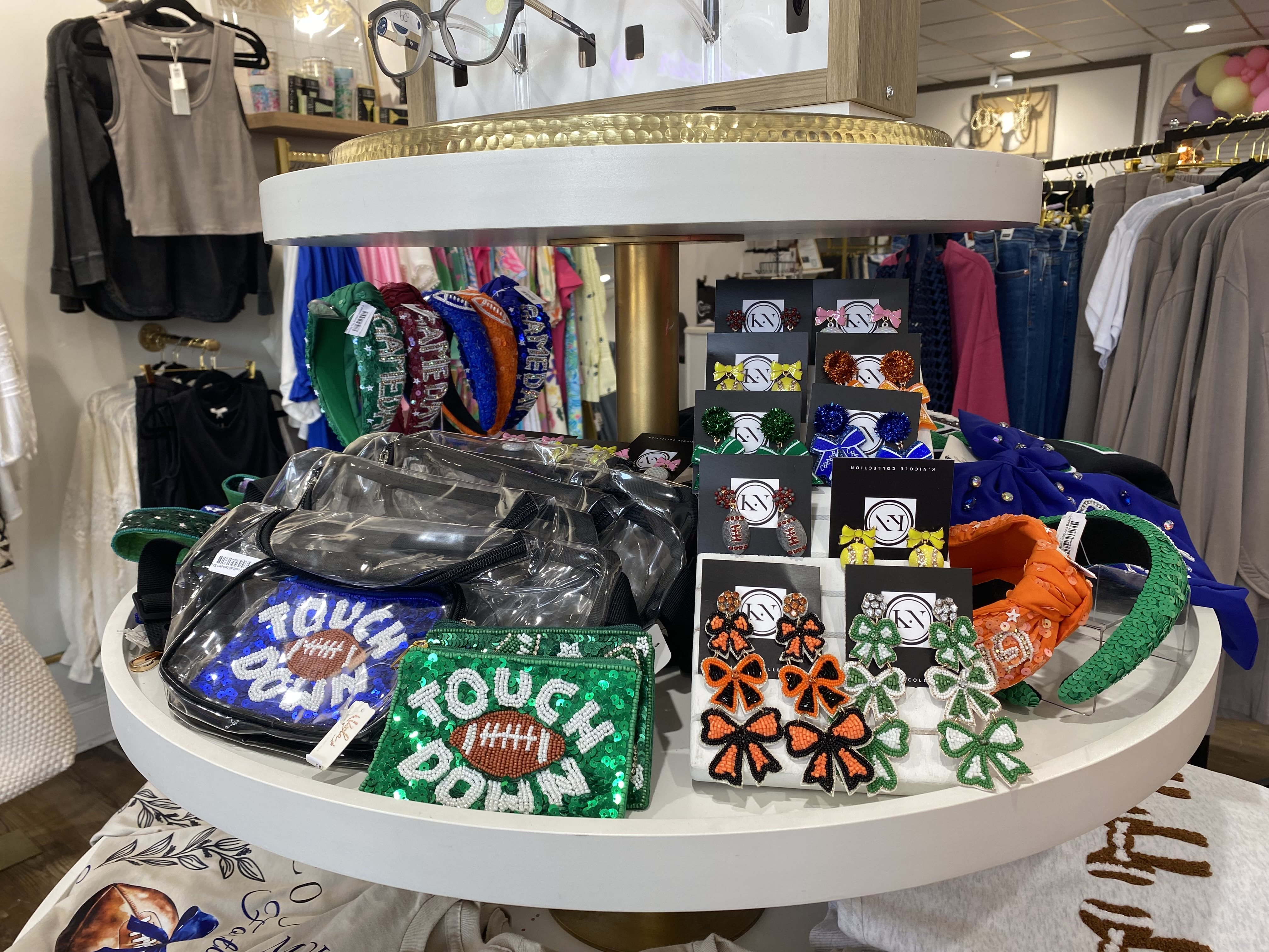 Looking for the flashiest fan gear? Charlie Boutique has earrings, headbands, shirts, and other accessories in your favorite local team’s colors. Game Day will never be the same again! Charlie Boutique also offers customized Trucker Hats. Select the patches, chain, and pins and the staff will assemble your hat in minutes.