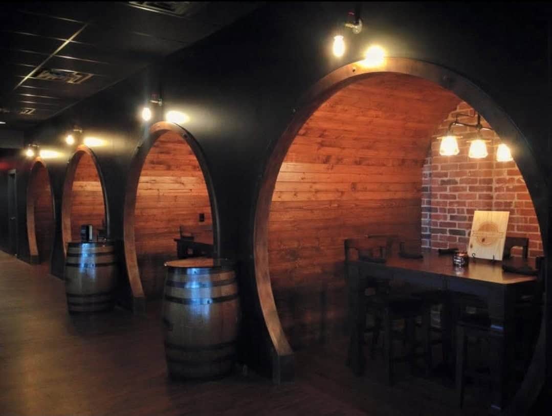 Wooden wine and whiskey barrel dining tables help make Bricks and Barrels a unique dining experience.